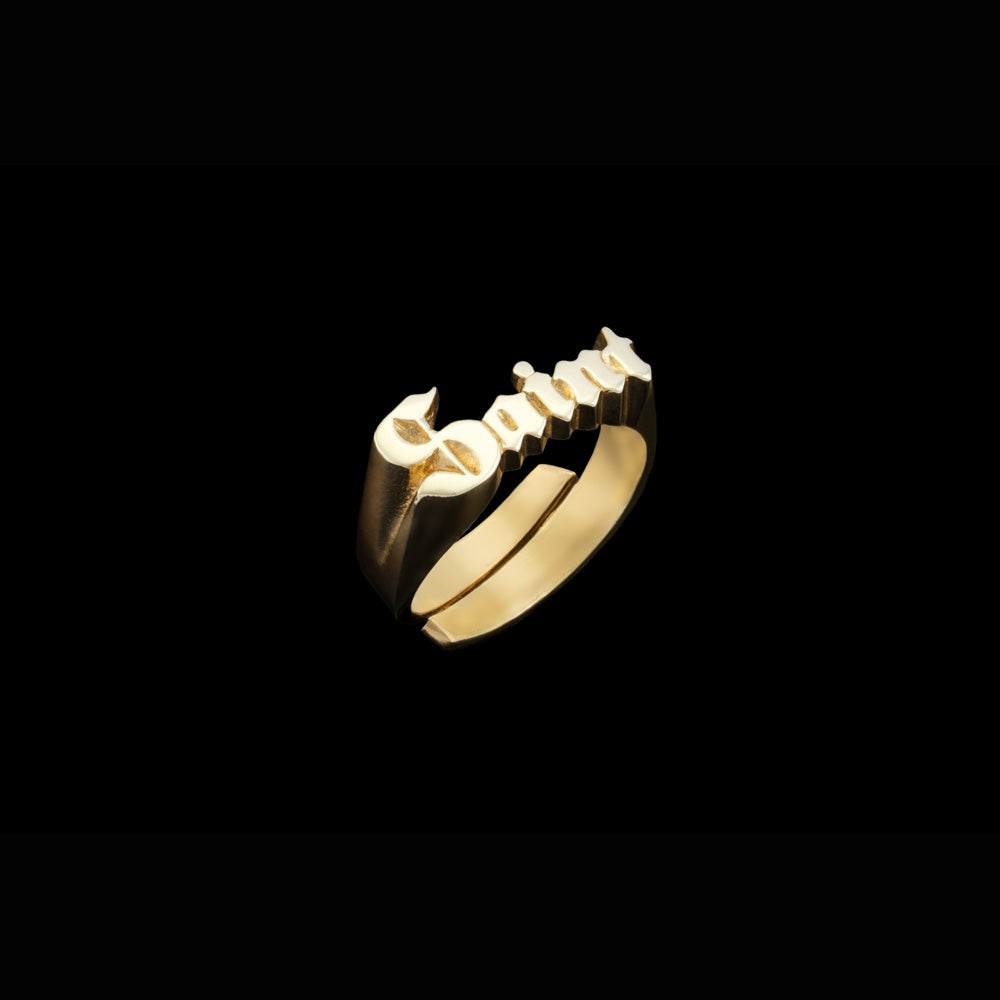 The ring is available in either brass or sterling silver with an open ring band, allowing the size to be individually adjusted.